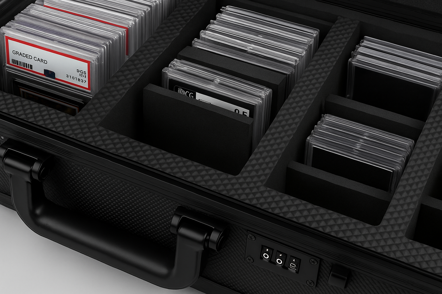 I love how sturdy this case is, with tons of foam padding inside to protect your cards. My graded cards fit in there perfectly, as well as my other cards which are in top loaders. Overall, great case, looks very cool and impressive, and I would definitely trust it to protect my cards while falling down a flight of stairs.